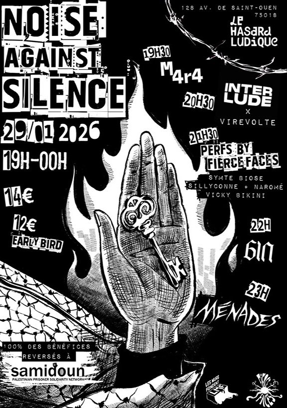 DATE 29/01/2026 LIEU Le Hasard Ludique, PARIS ARTISTE.S GIN Soirée Noise Against Silence en soutien au peuple palestinien Réservation RÉSEAUX SOCIAUX Instagram Youtube Tiktok Link